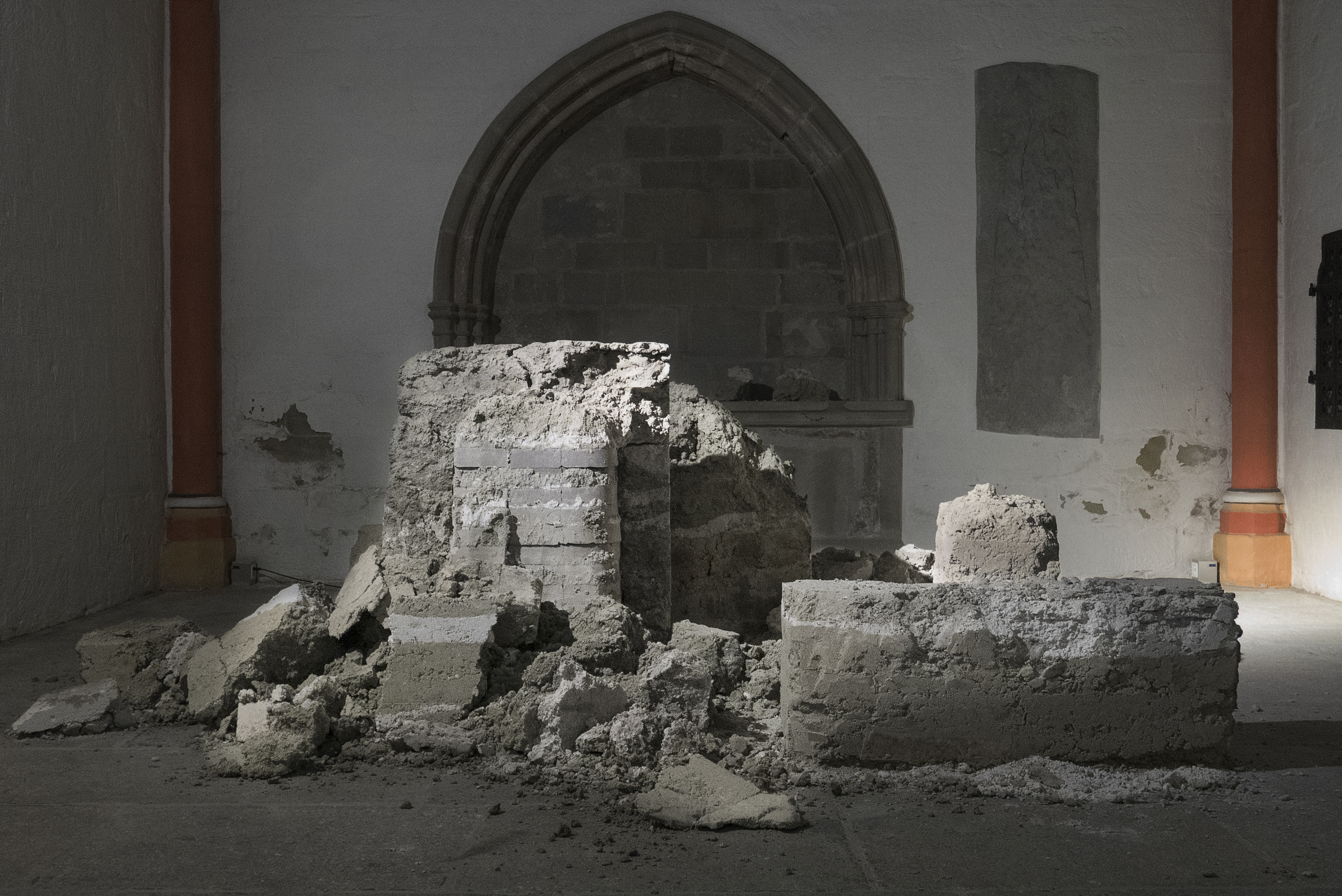 At first glance, Futur Âge de Pierre appears as a mineral underground garden. The rocks that make it up are the work of a living organism, the bacterium Bacillus pasteurii, capable of cementing sand from a solution of urea and calcium chloride. This relatively fast process (a few days), which allows the production of monoliths in situ, offers a counterfoot to the long term geological formation. In this garden evoking a petrified forest, life seems to be absent. But it is precisely the micro-organisms that allowed the rocks to originate and defined their shape and typology.